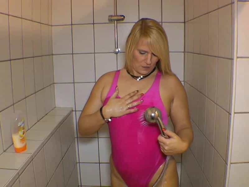 Schau mal wie ich mit meinem Pinken Badeanzug Duschen gehe. Ist er nicht schön eng auf meiner Haut wenn er dann noch nass wird.