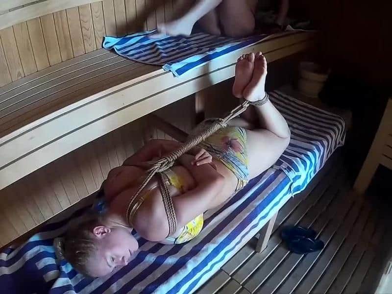 Wenns warm wird, können heiße Mädels im Spiel sein. Oder eine finnische Sauna. Oder beides. Denn dort im Spa verpackt Riggerin Hera Delgado ihr kleines Bunny zu einem Hogtie-Paket und lässt sie in der Hitze schmoren.
