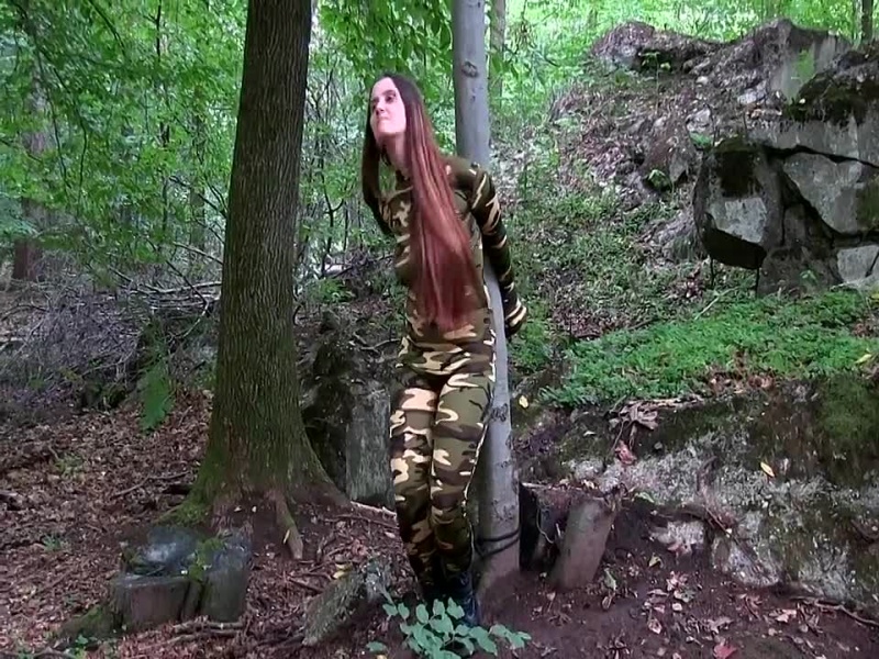 ich in meinem Tarncatsuit und Springerstiefeln an einen Baum gefesselt