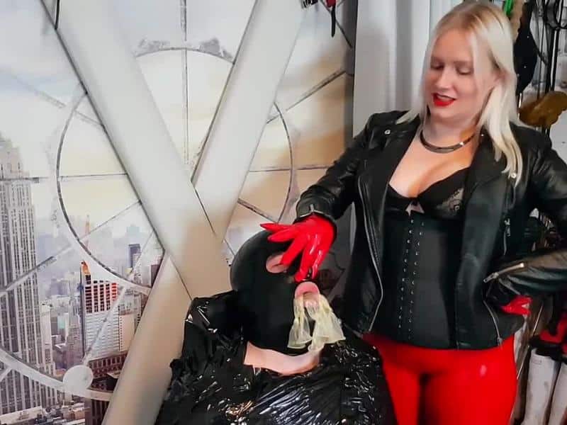 Dieses Video ist der ultimative Beweis dafür, wie grausam Lady Karame sein kann. Das Video beginnt mit dem, an einen Stuhl gefesselten Sklaven. Lady Karame hat ein Geschenk für ihn. Ein schreckliches Geschenk. Sie hatte ein paar schöne Stunden mit ihrem Liebhaber zeigt ihm voller Freude eine Tasse voller gefüllter Kondome. Ja, sie hat die gebrauchten Kondome für ihren Sklaven aufbewahrt. Zuerst lässt sie den Sklaven die Kondom-gefüllte Tasse riechen. Sie lässt, das mit Sperma gefüllte Kondom, vor seinem Mund baumeln und lacht höhnisch. Sie nimmt noch eins und noch eins und noch eins heraus, bis sieben, mit Sperma gefüllte Kondome, auf seinem Kopf ruhen. Du kannst das Entsetzen und die Hoffnungslosigkeit im Gesicht des Sklaven sehen. Lady Karame befiehlt dem Sklaven, den Mund zu öffnen. Was als Nächstes kommt, ist das Undenkbare. Sie fängt an, die mit Sperma gefüllte Kondome nacheinander in seinen Mund zu legen. Alle sieben Kondome voller Sperma liegen in seinem Mund. Er kann nicht einmal atmen! Sie bedeckt seine Nase und er muss versuchen durch die Kondome zu atmen. Das ist ein unglaubliches Video. Erniedrigung von der feinsten Art.