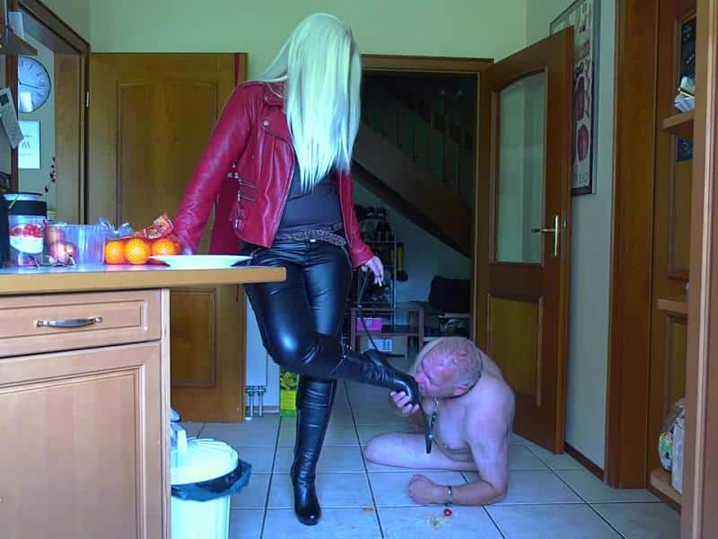 Du hast den ganzen Tag an der Leine verbracht und ich komme endlich nach Hause. Zum Glück für dich, habe ich dich nicht vergessen und möchte nun etwas Spaß mit dir. Ein paar Ohrfeigen, etwas Spucke und ein leckeres Mal von vorgestern, gönne ich dir. Als Aschenbecher bist du natürlich auch gerade gut genug und wirst natürlich ALLES aufessen, was ich dir gebe. Auch, wenn ich mit meinen dreckigen High Heels darauf herum trampel, wirst du es dann fein säuberlich von meinen Boots lecken.