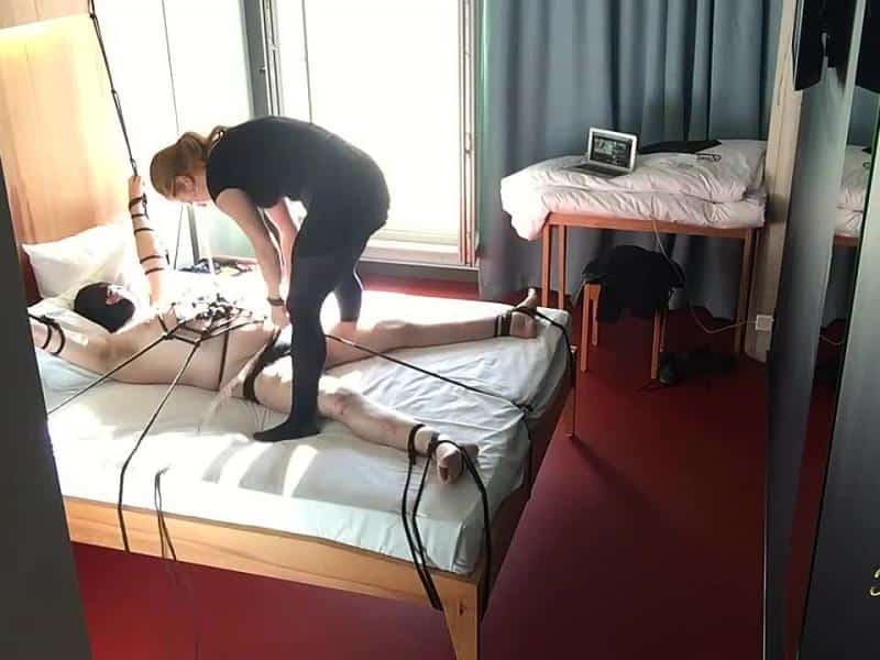 Während einer Session im Hotel wird der Mann mit einem Spinnennetz aufs Bett gefesselt….