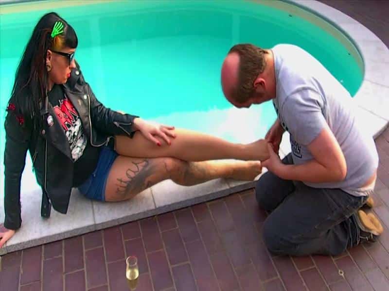 Mein treu ergebener Diener massiert mir am Pool die Füße, mit Blick auf meinen göttlichen Hintern in sexy Jeans Short.
