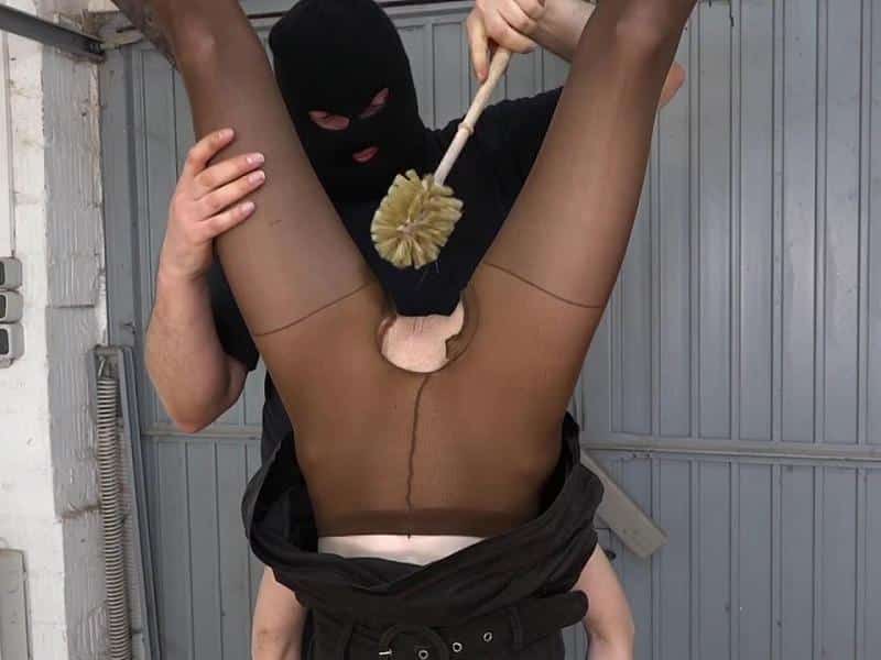 Kopfüber in der Garage hingehängt wird der Schlampe die Strumpfhose zerissen und das Loch mit der Toilettenbürste gereinigt. Dann wird das Mösenloch mit dem Doxy zum vibrieren gebracht.
