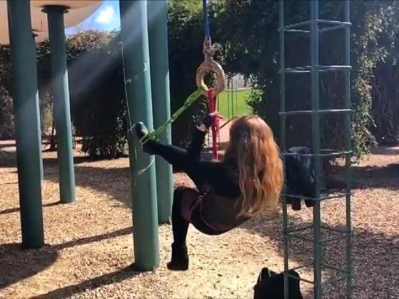 Wo Stangen oder Geländer sind kann Hera nicht widerstehen. Sie hängt den Bondagering auf, fesselt ihre Hüften und die Füße. Und schon schwebt sie wie auf einer Schaukel in den Seilen einer Hängebondage.