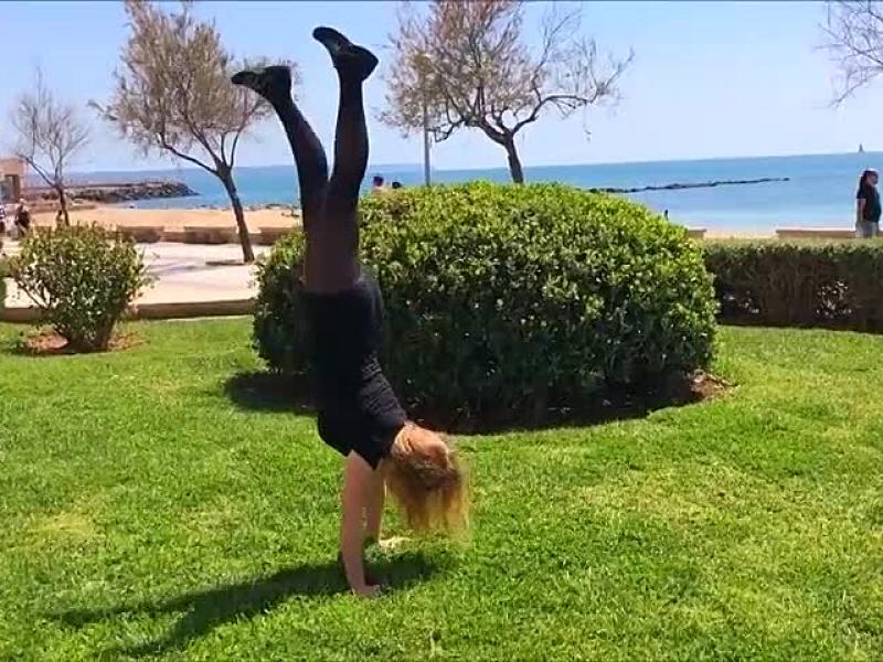 An der Strandpromenade oder am Flughafen mache ich Handstand-Übungen. Dabei sind meine Beine schön in Nylonstrumpfhosen gehüllt. An der Taucherbasis trainiere ich sogar im Neoprenanzug.